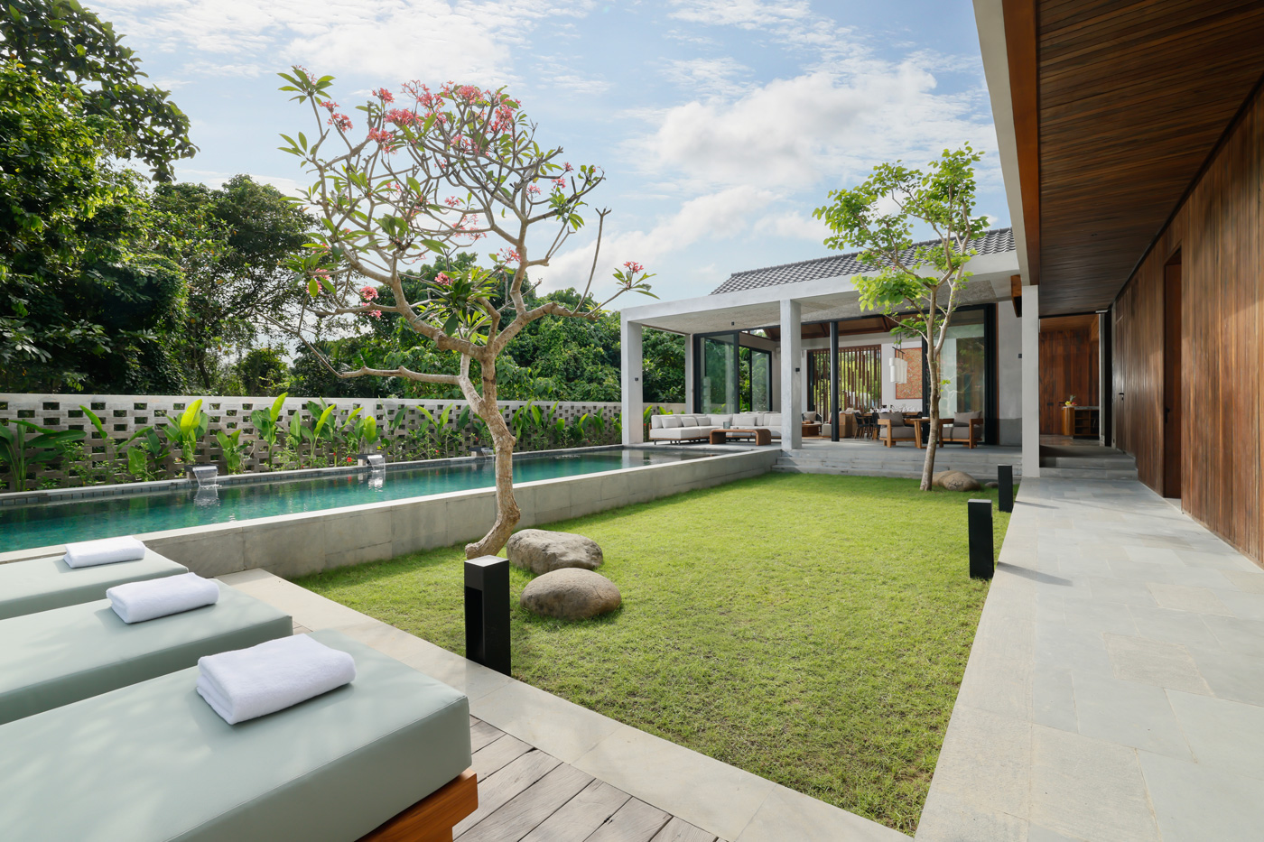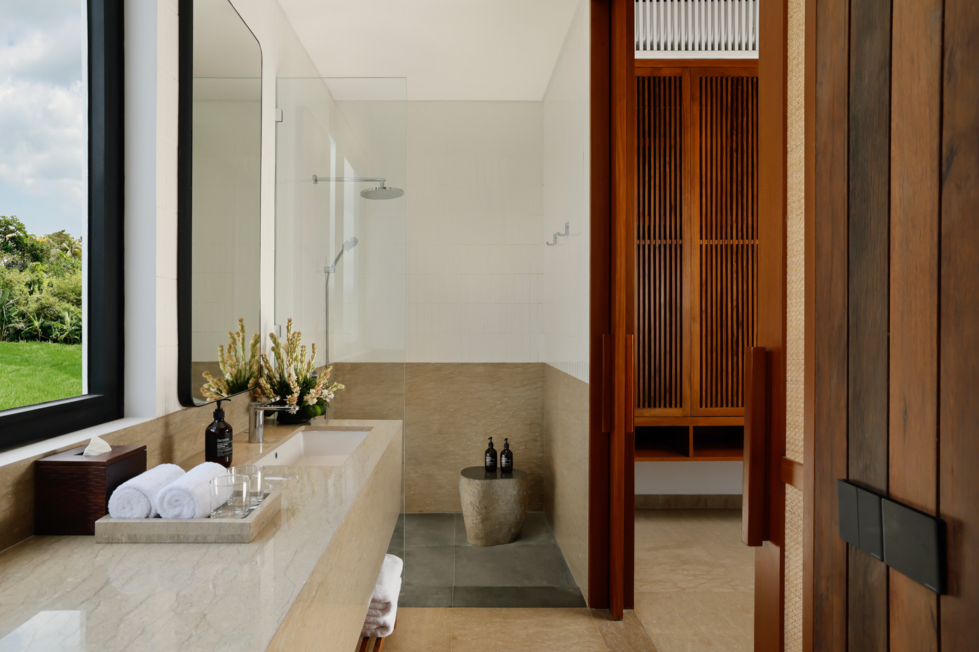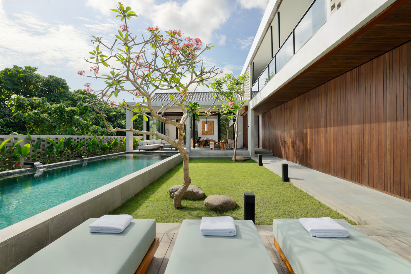 The villa features 7 bedrooms in total. There are 4 king bedrooms and 3 twin bedrooms. Each room has an en-suite bathroom, air conditioning, high-quality bedding, and stylish décor. Every bathroom also includes a semi open-air shower. As a result, guests can enjoy both comfort and a natural tropical feel.