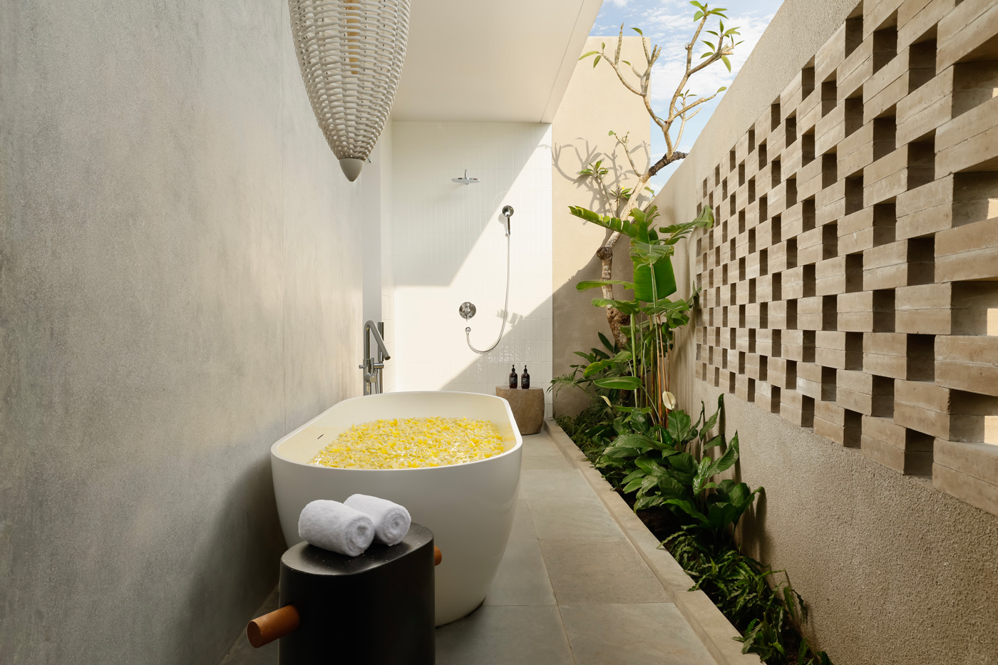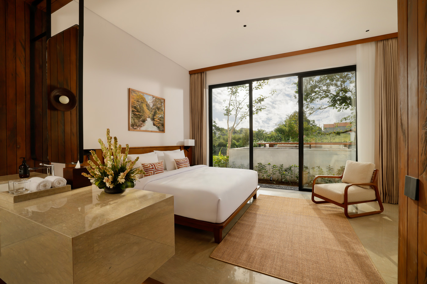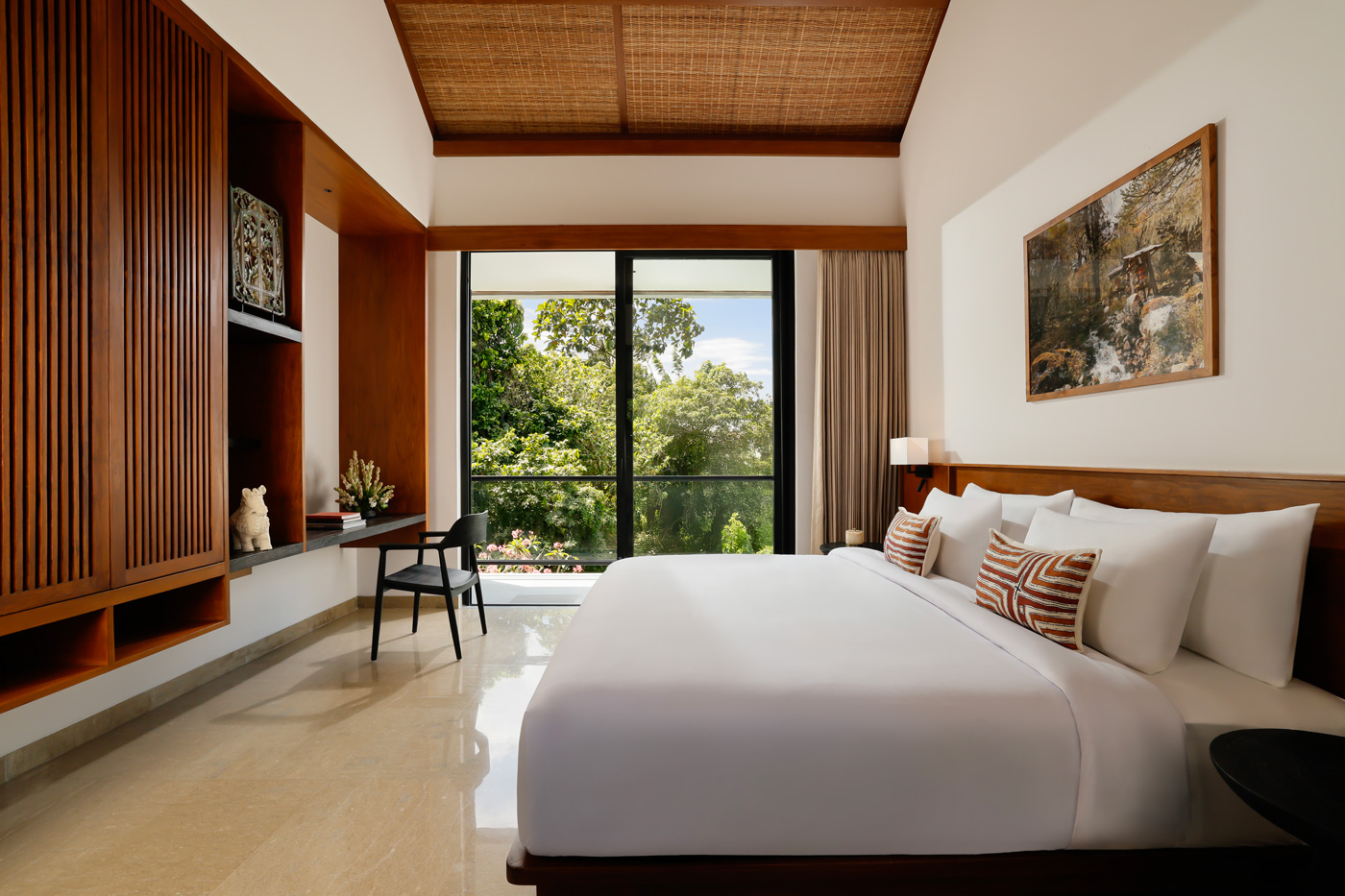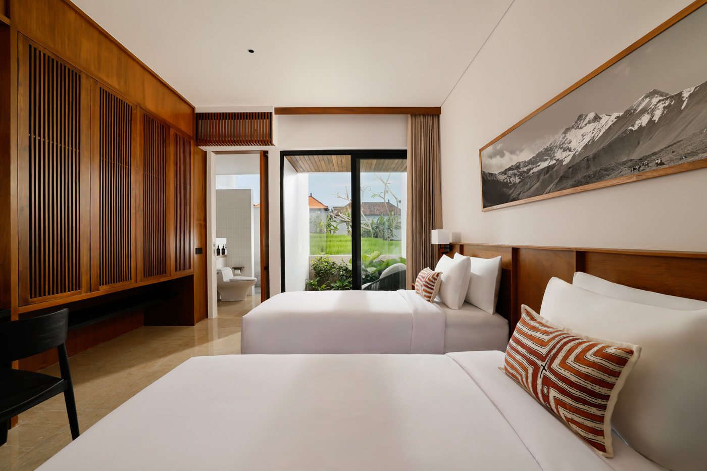 The villa features 7 bedrooms in total. There are 4 king bedrooms and 3 twin bedrooms. Each room has an en-suite bathroom, air conditioning, high-quality bedding, and stylish décor. Every bathroom also includes a semi open-air shower. As a result, guests can enjoy both comfort and a natural tropical feel.