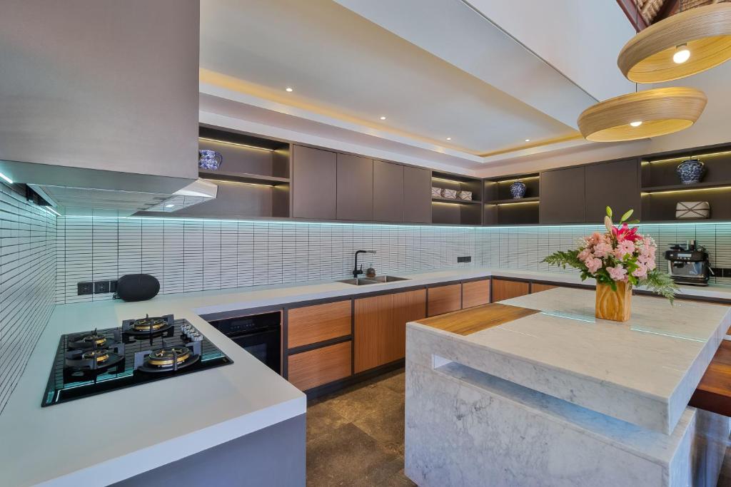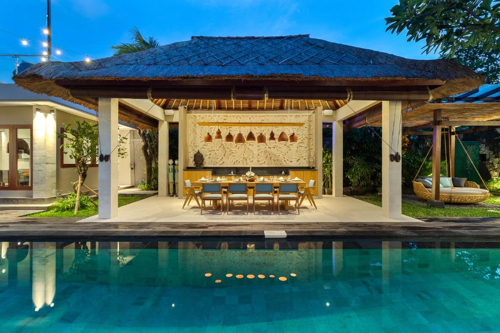 The villa features spacious living and dining areas, a fully equipped kitchen, and a rooftop deck with a bar and BBQ area. Enjoy your own private 12-meter swimming pool, surrounded by lush gardens and open spaces for yoga or outdoor dining.