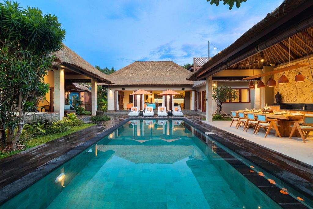 Villa Mahkota Seminyak is a stunning five-bedroom private villa that blends Balinese charm with modern comfort. Located in the heart of Seminyak, it’s perfect for families or groups seeking a relaxing yet stylish retreat.