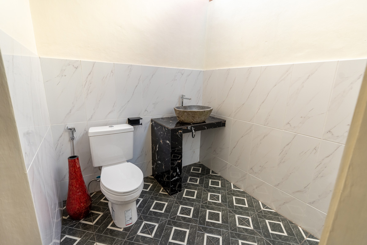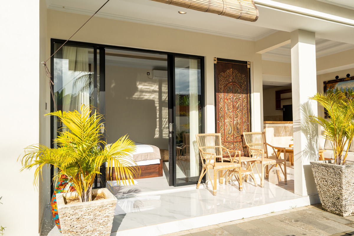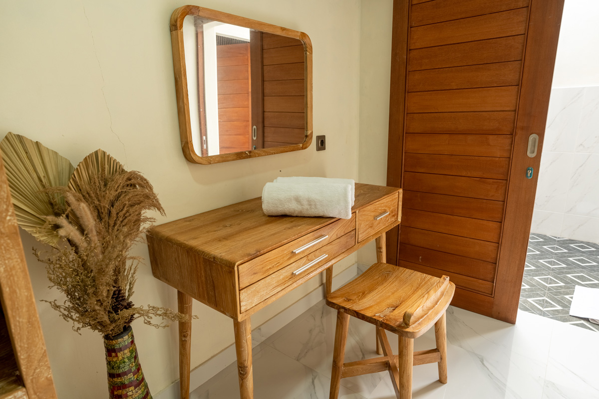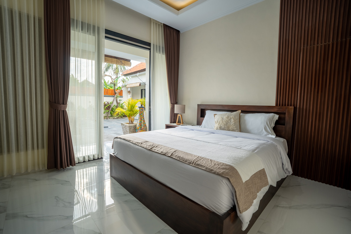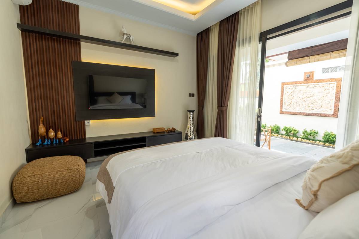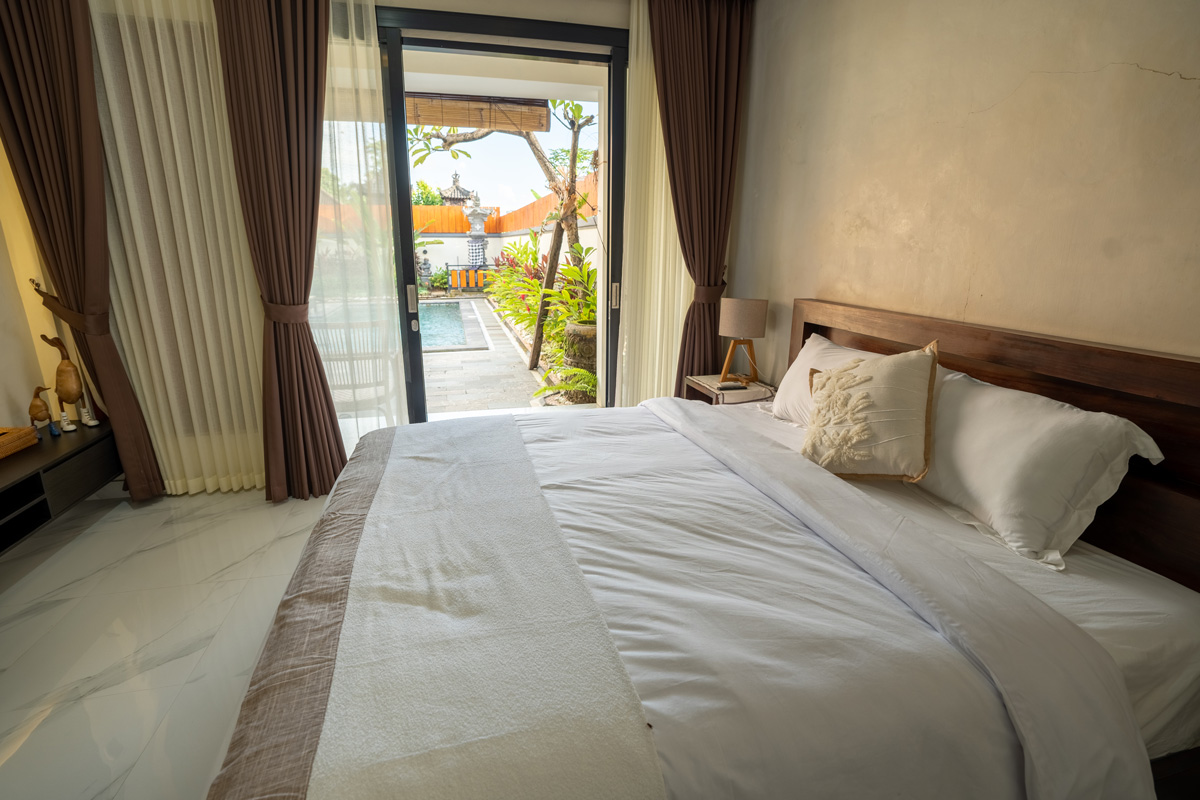 Villa Manik Uma features three spacious, air-conditioned bedrooms, each styled for relaxation. The master suite occupies its own private pavilion with a king-size bed, writing desk, and a luxurious ensuite bathroom featuring a semi-open shower for a true tropical experience. The additional two bedrooms, equally stylish and comfortable, provide garden or pool views and are ideal for families or friends traveling together. Premium bedding, soft linens, and thoughtful details ensure a restful night’s sleep.