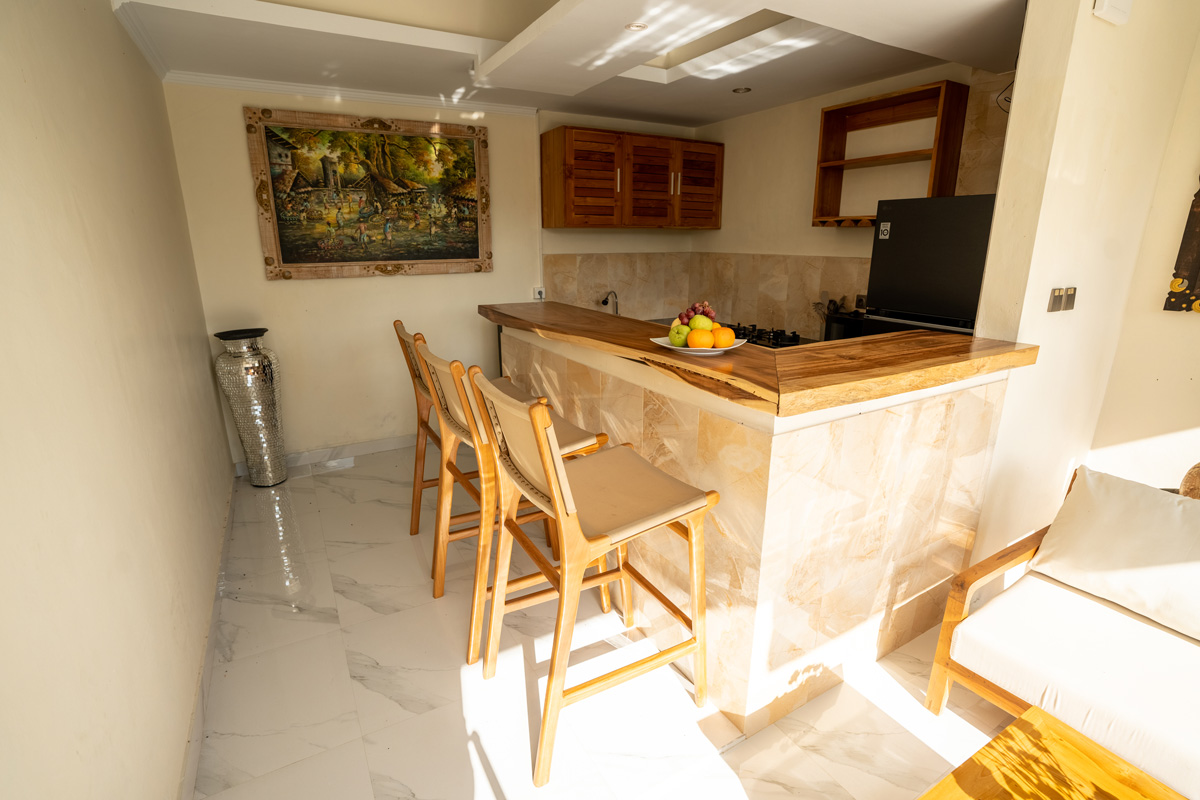 Built with a tropical open-plan concept, the villa combines traditional Balinese touches with contemporary finishes. The living area flows seamlessly into the outdoors, overlooking the shimmering private pool and panoramic rice fields. Whether you’re sharing meals at the elegant dining table, lounging by the pool, or preparing a feast in the fully equipped kitchen, every space is designed to feel both luxurious and homely.