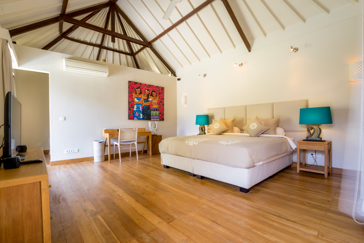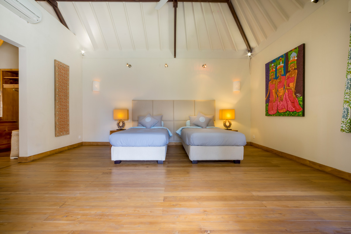 Villa Markisa offers three spacious and air-conditioned bedrooms. Each room has high-quality beds, fresh sheets, and plush pillows to ensure a restful sleep. The master bedroom sits in its own private pavilion, opening directly to the garden. This luxurious room features a king-size bed, a TV with international channels, a writing desk, and a dressing room. Its stunning open-air ensuite bathroom includes a large soaking bathtub and an outdoor shower, allowing you to enjoy Bali’s tropical beauty in total privacy.