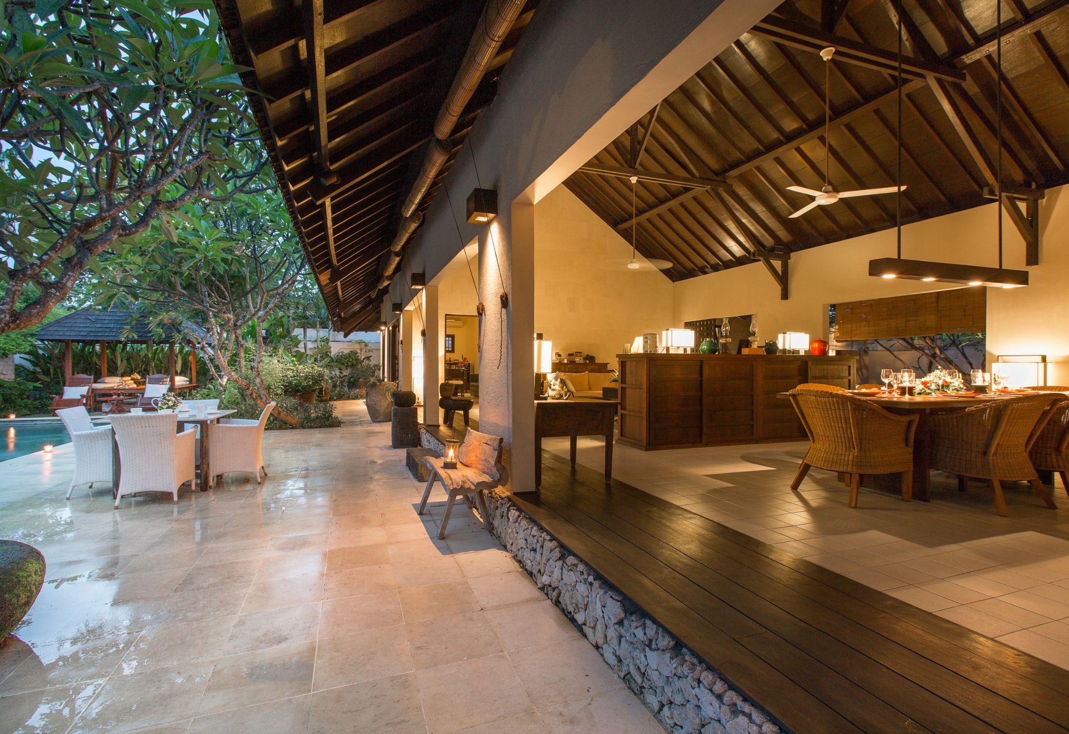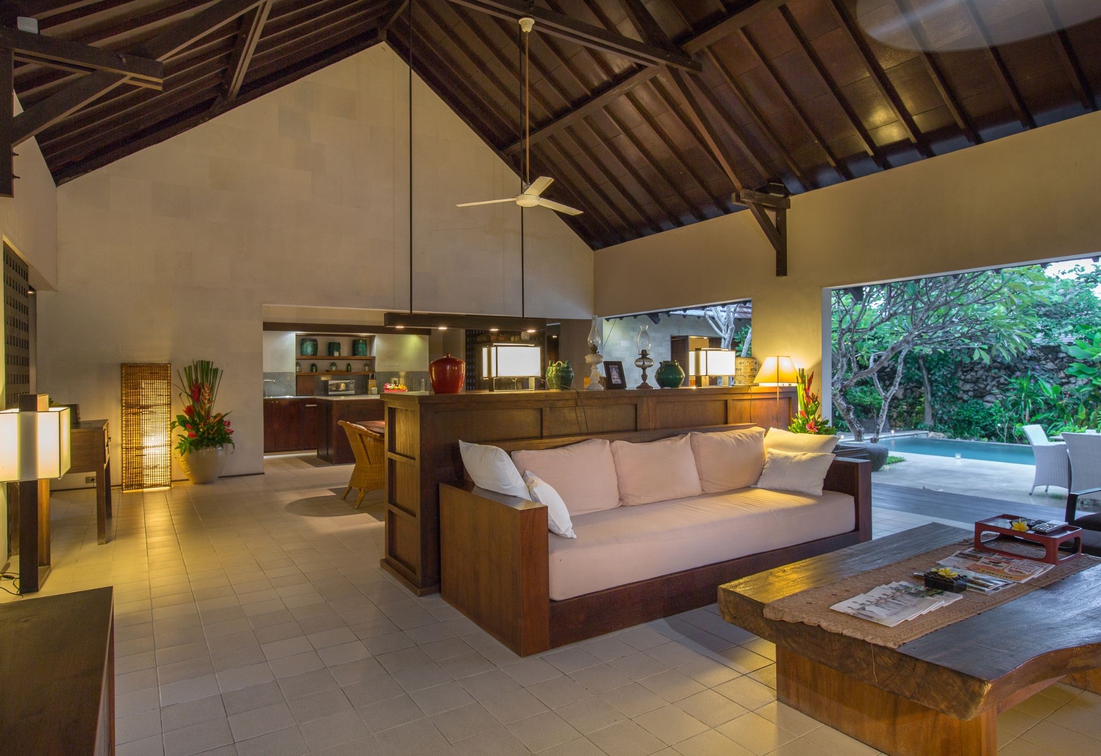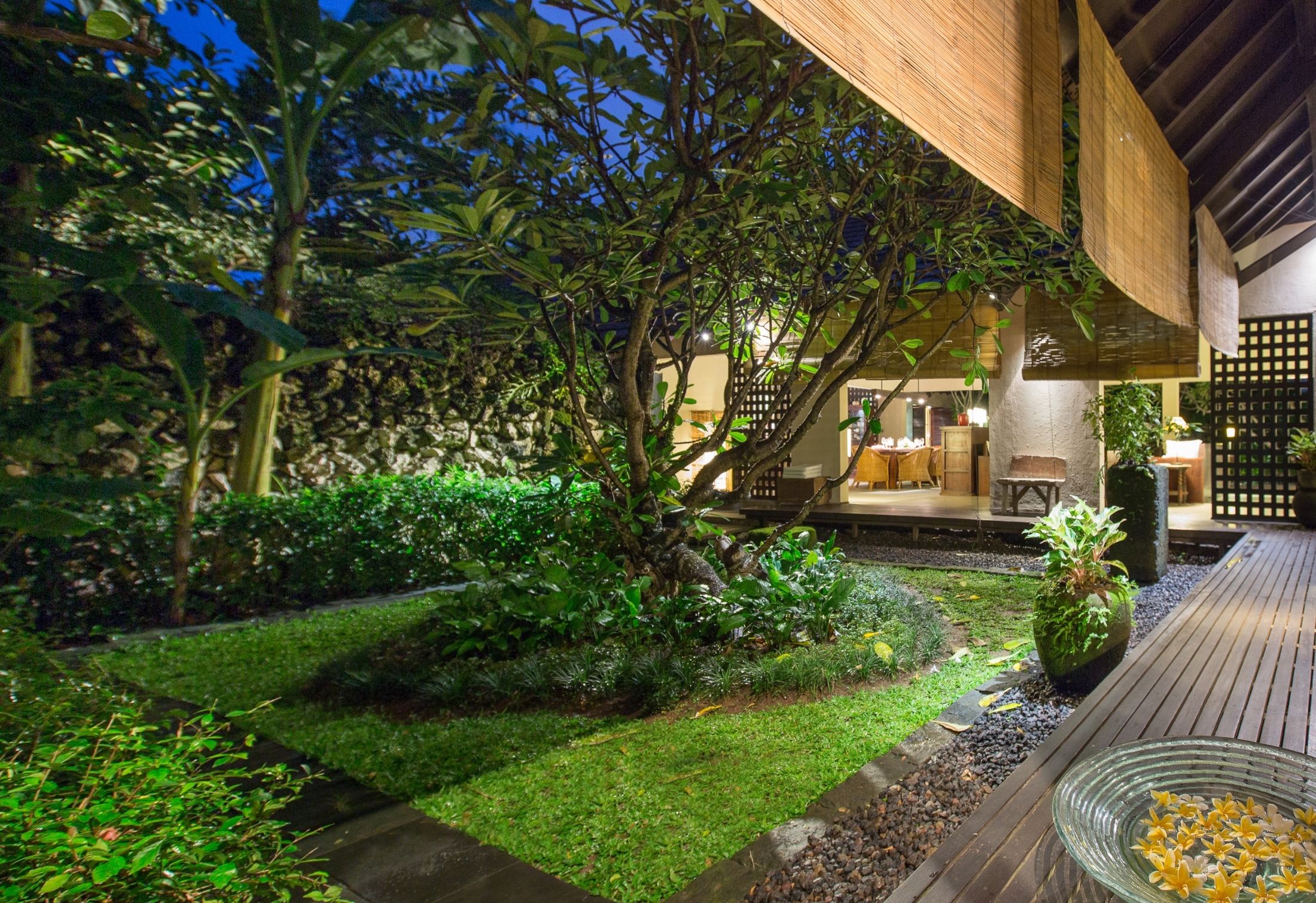 Step outside to discover a tranquil garden oasis with a swimming pool and cozy relaxation area. The villa comprises a master bedroom with a king-sized bed, a twin bedroom, and a standard bedroom. Each bedroom features its own bathroom with a bathtub (excluding the twin bedroom) and a designated relaxation space. What sets this villa apart is its serene ambiance, with low-set lighting and an impeccably landscaped Japanese-themed garden.
