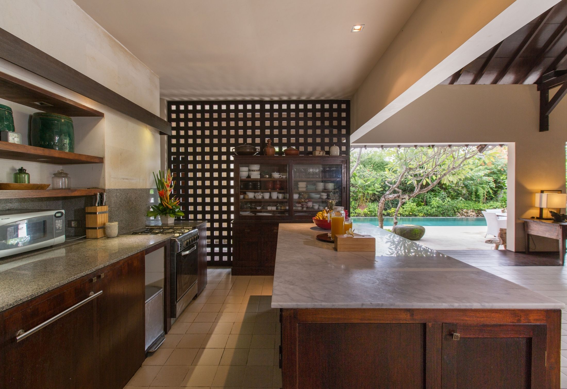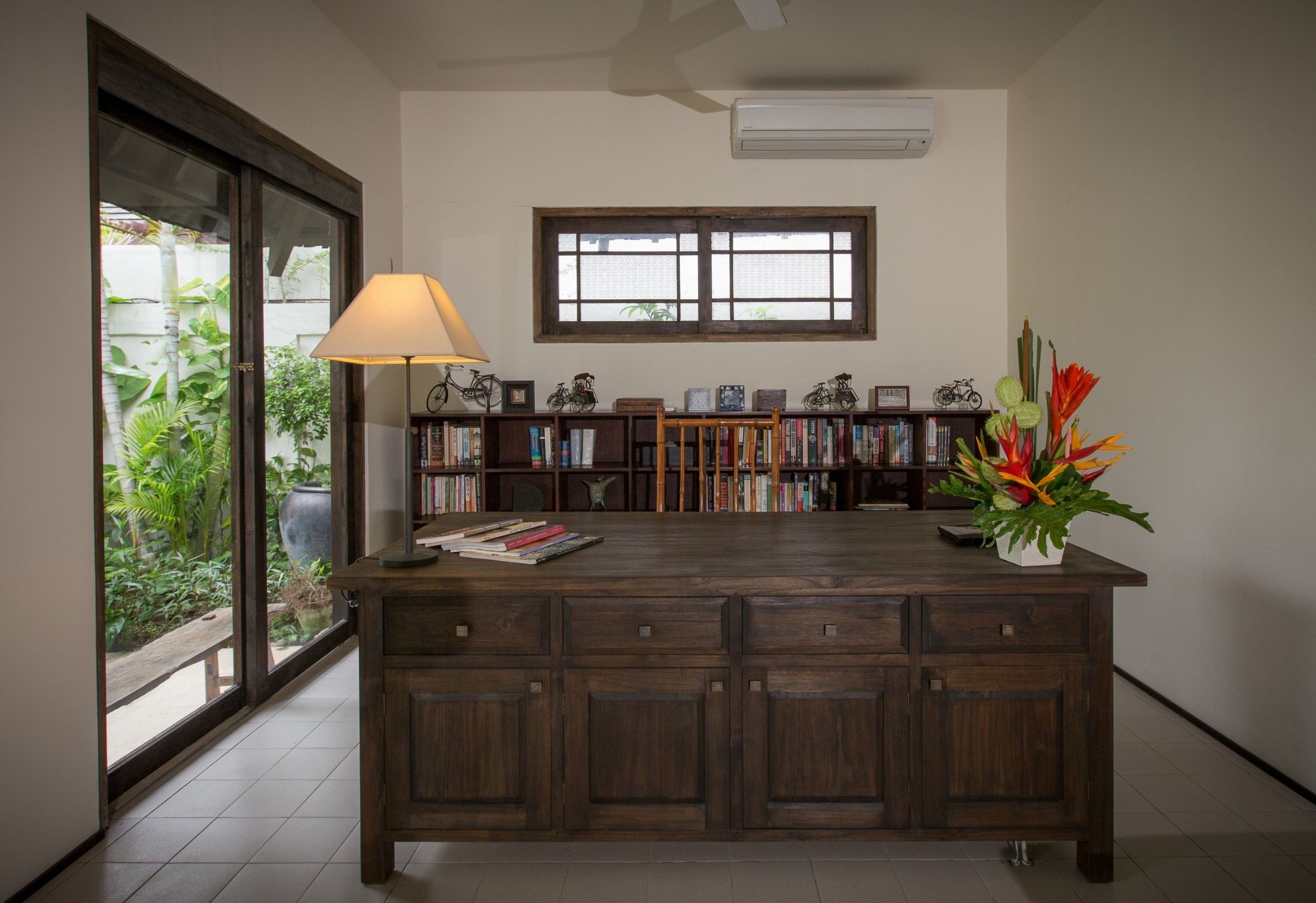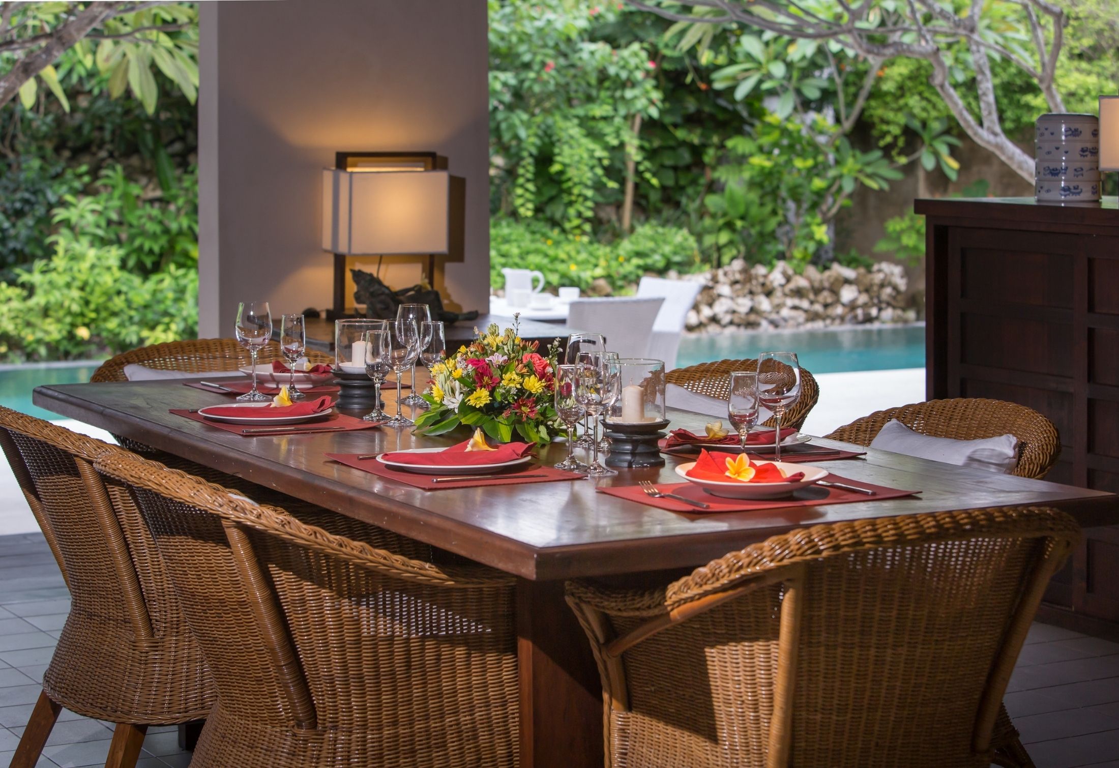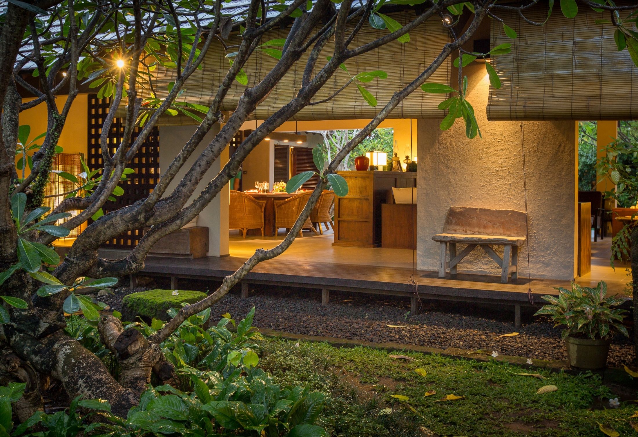 Step outside to discover a tranquil garden oasis with a swimming pool and cozy relaxation area. The villa comprises a master bedroom with a king-sized bed, a twin bedroom, and a standard bedroom. Each bedroom features its own bathroom with a bathtub (excluding the twin bedroom) and a designated relaxation space. What sets this villa apart is its serene ambiance, with low-set lighting and an impeccably landscaped Japanese-themed garden.