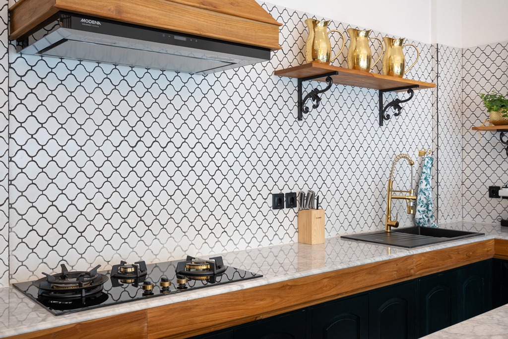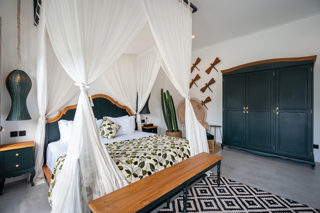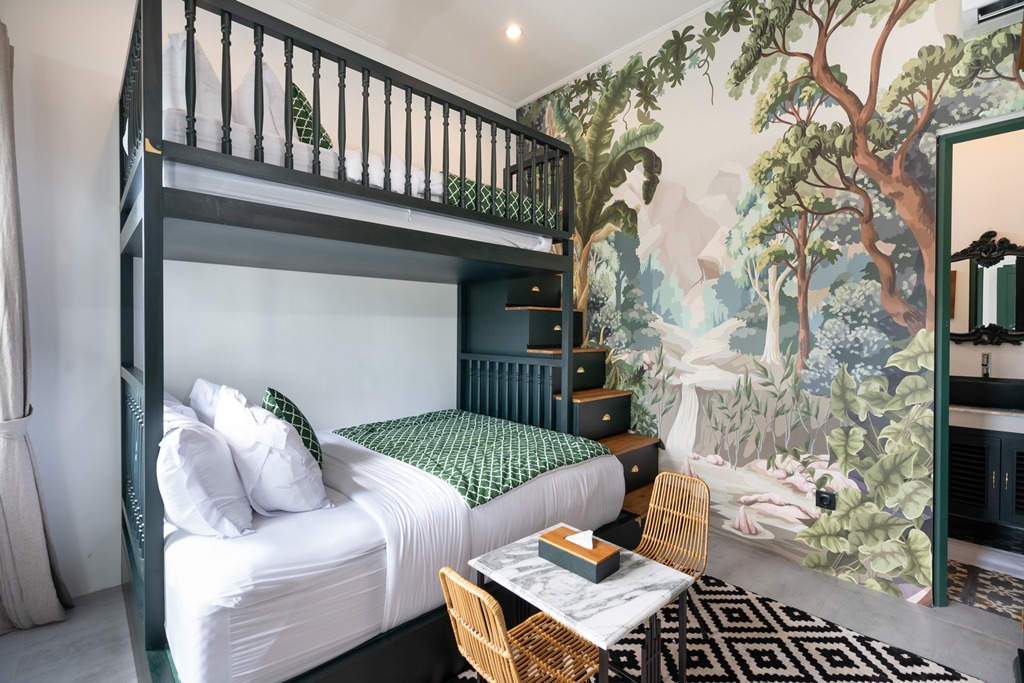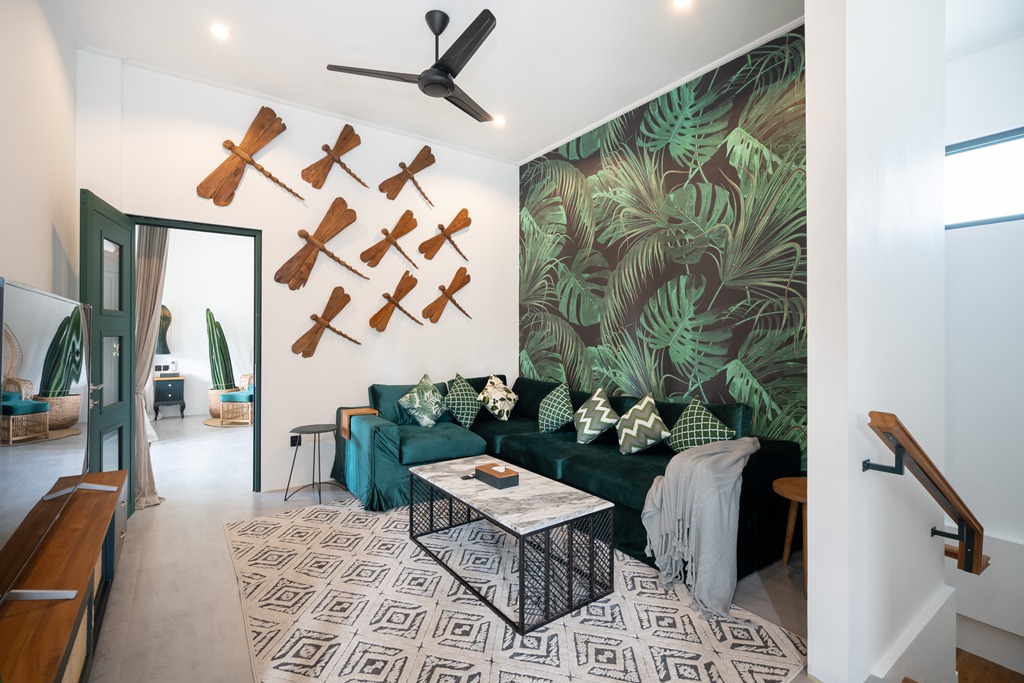 Three bedrooms are located upstairs, each with a private balcony overlooking the greenery. The downstairs bedroom connects directly to the living room and features a Moroccan-inspired bathroom with bright tiles and unique textures.