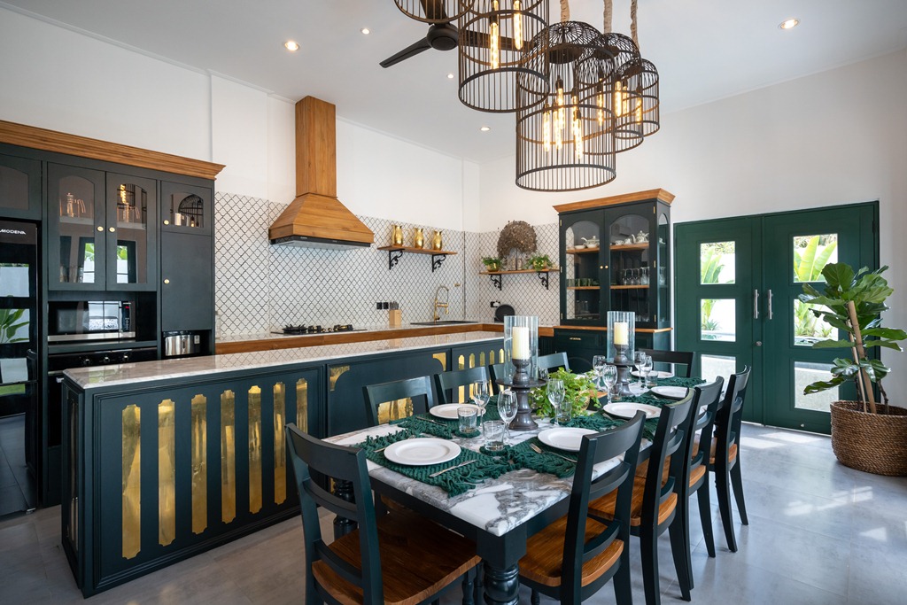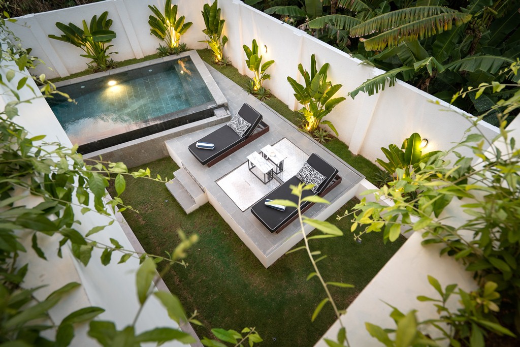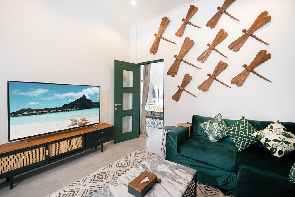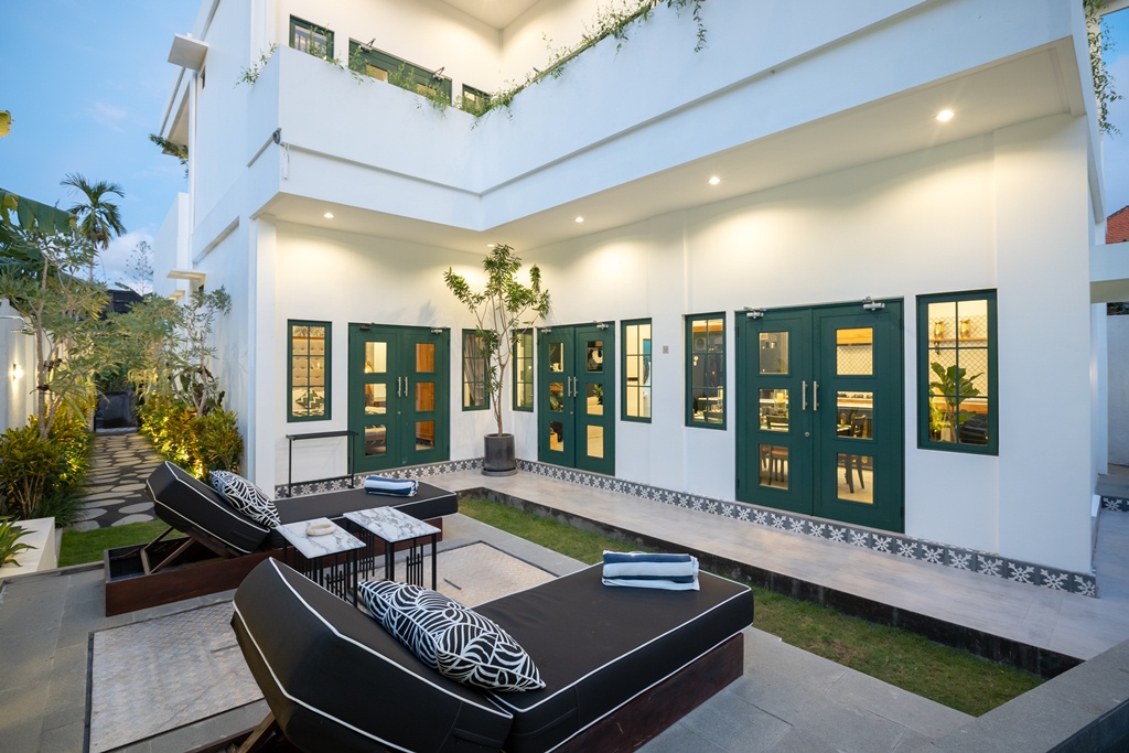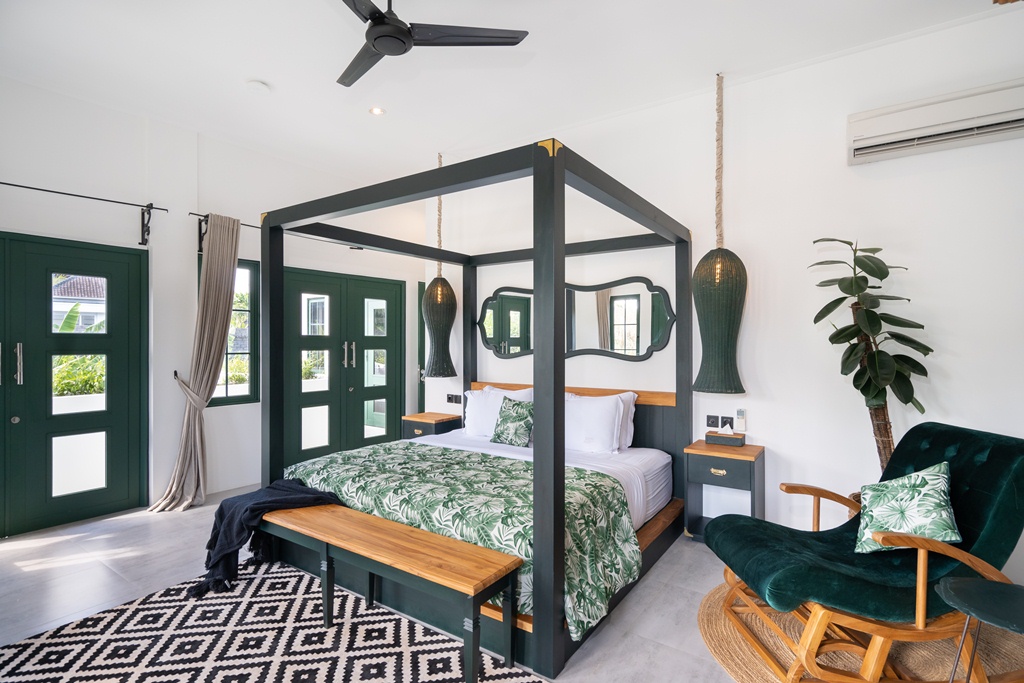 Designed in refreshing green and white tones, this villa blends modern comfort with tropical elegance. The spacious living and dining area opens directly to a raised swimming pool and two sundecks, perfect for relaxing under the Bali sun. Each of the four bedrooms features an ensuite bathroom, air conditioning, and natural décor.