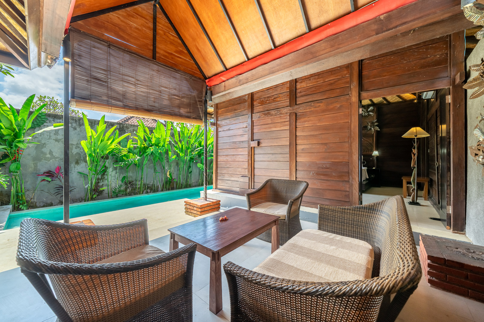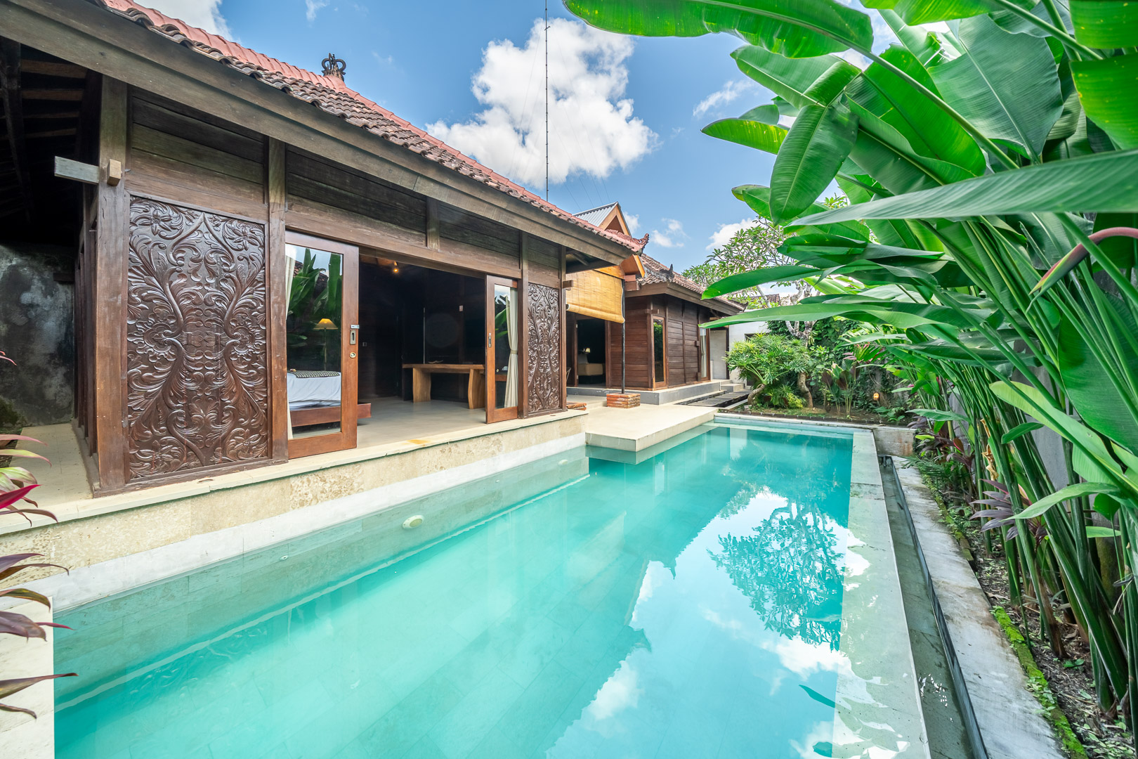 The villa features contemporary design with an open-plan living room, a fully equipped kitchen, and bright two bedrooms complete with air-conditioning and en-suite bathrooms. The private swimming pool is the centerpiece of the property, surrounded by tropical plants that create a soothing ambiance. Whether you want to relax by the pool, enjoy a home-cooked meal, or plan day trips around Bali, this villa is designed to make your stay effortless.