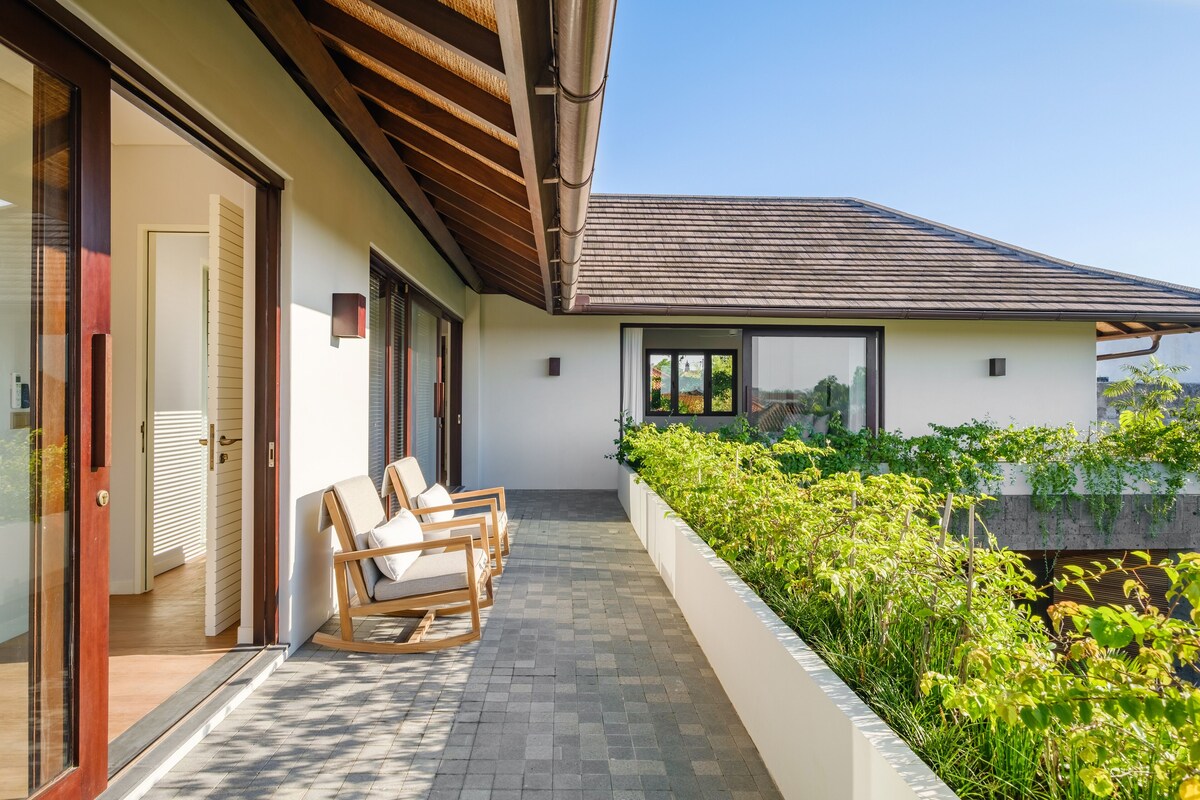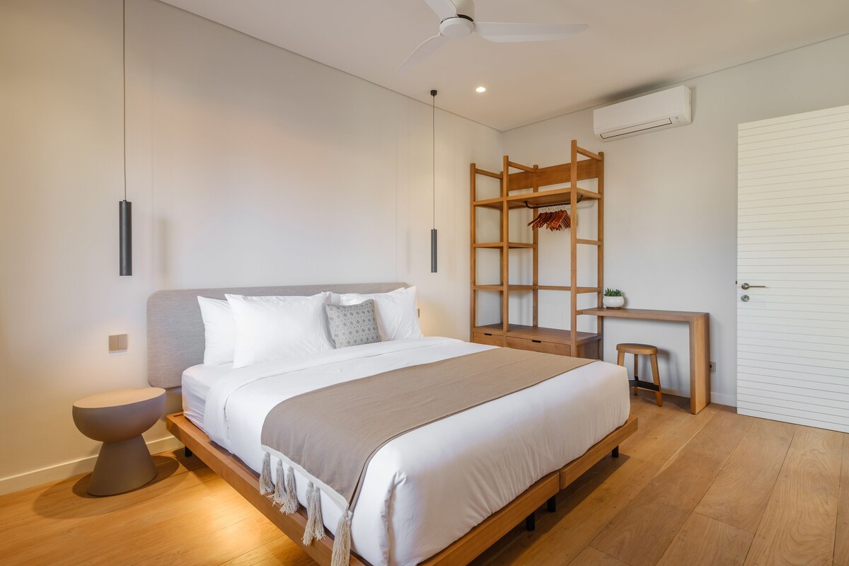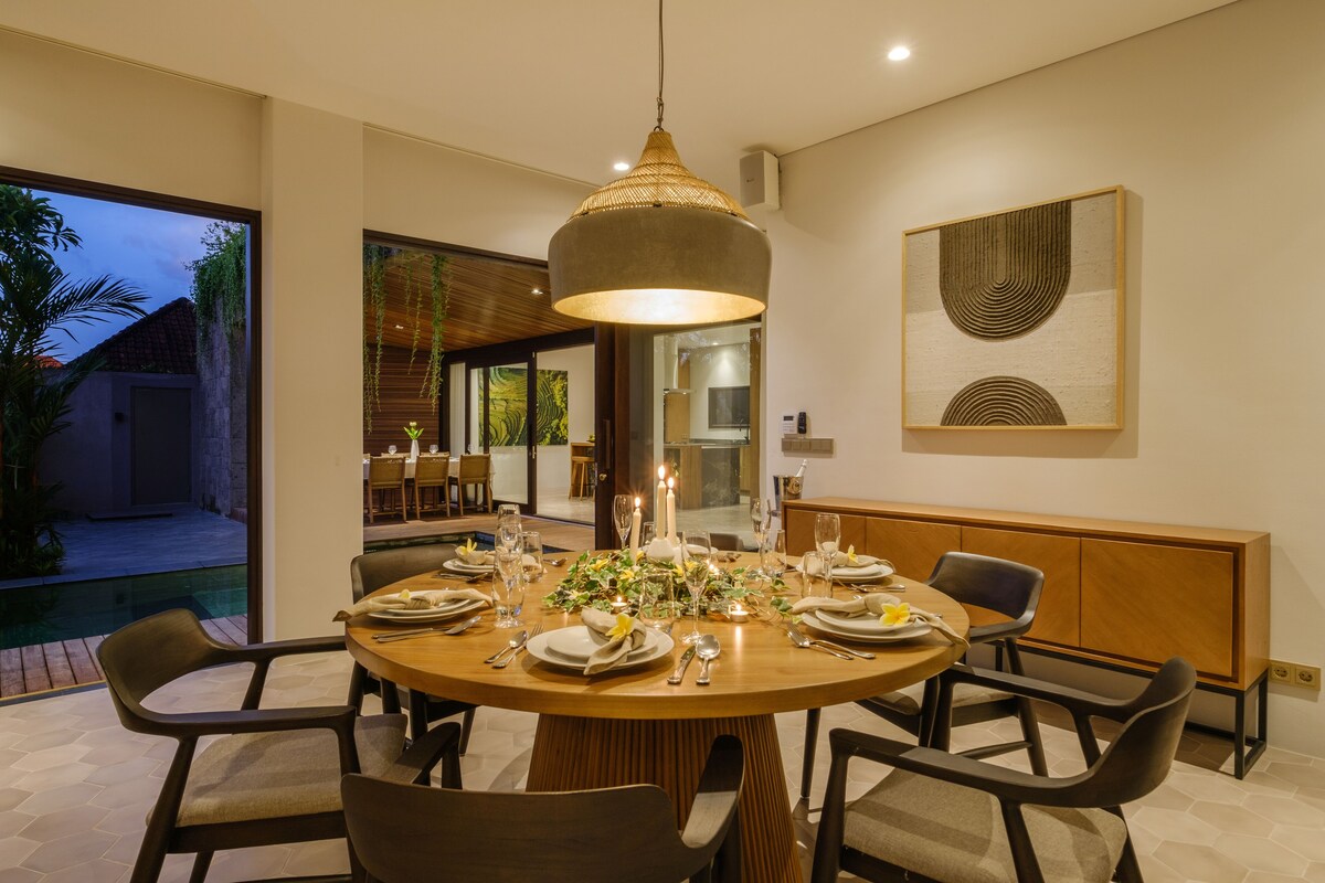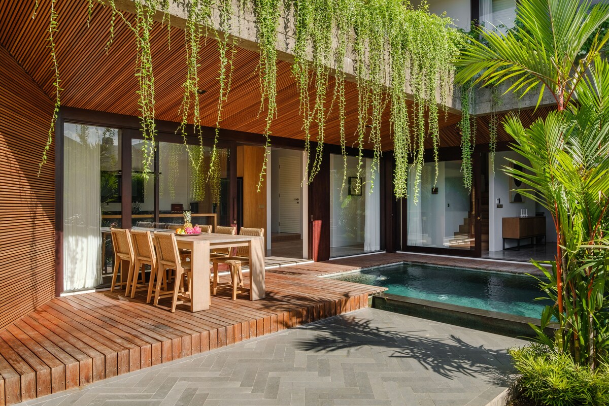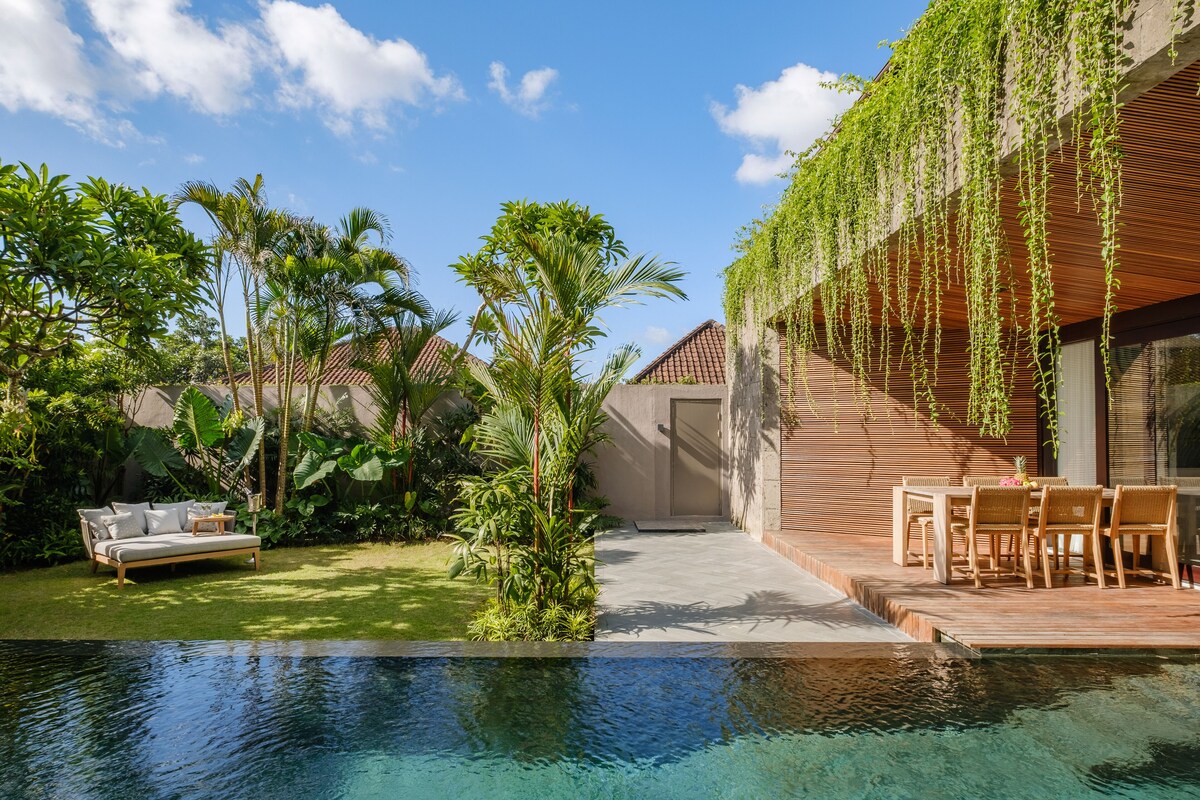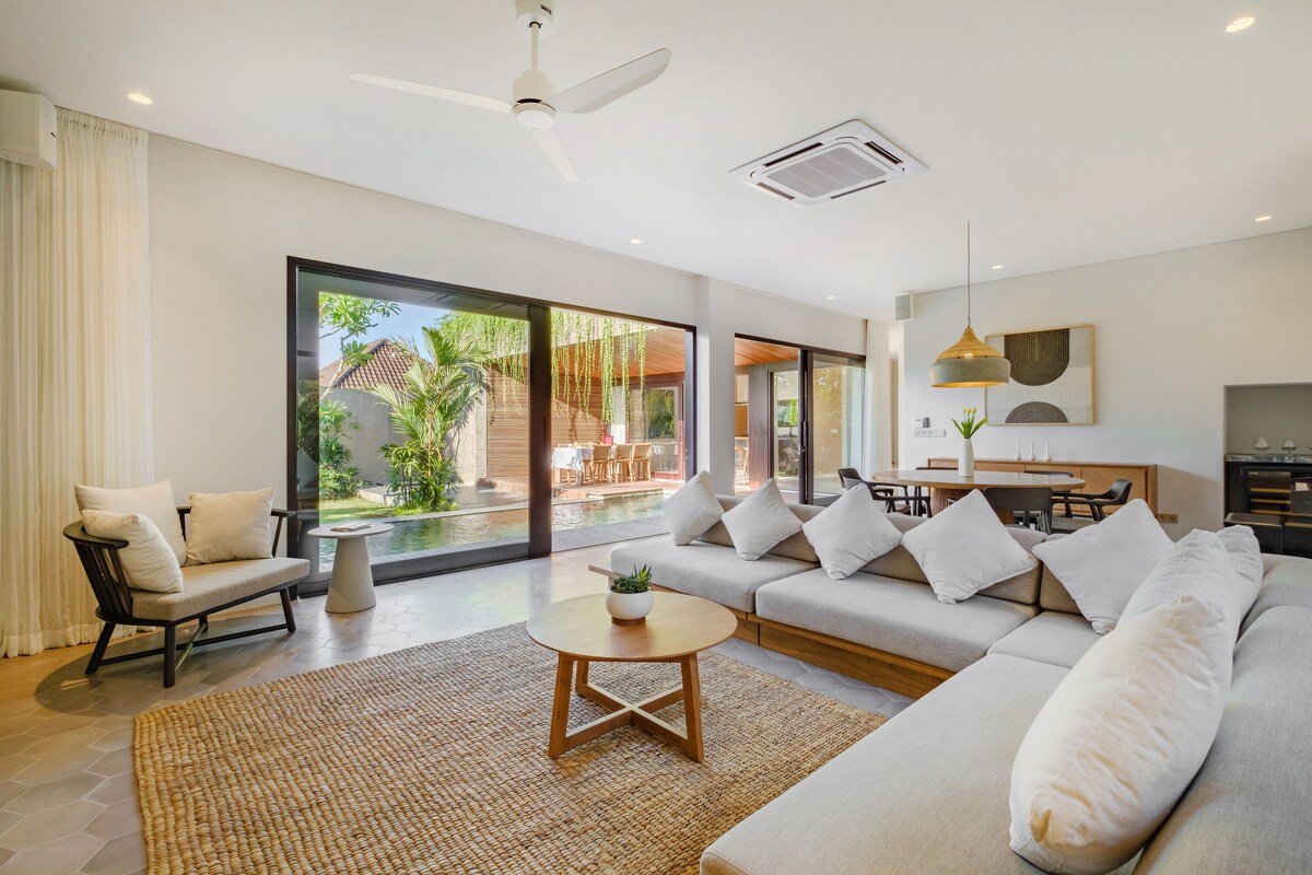 Each bedroom includes an ensuite bathroom, air conditioning, and direct access to the pool or garden. The open-plan living and dining areas connect smoothly to the outdoor space, creating a bright and breezy atmosphere. The villa’s private pool, surrounded by lush greenery, is ideal for lazy afternoons or refreshing swims under the Bali sun.
